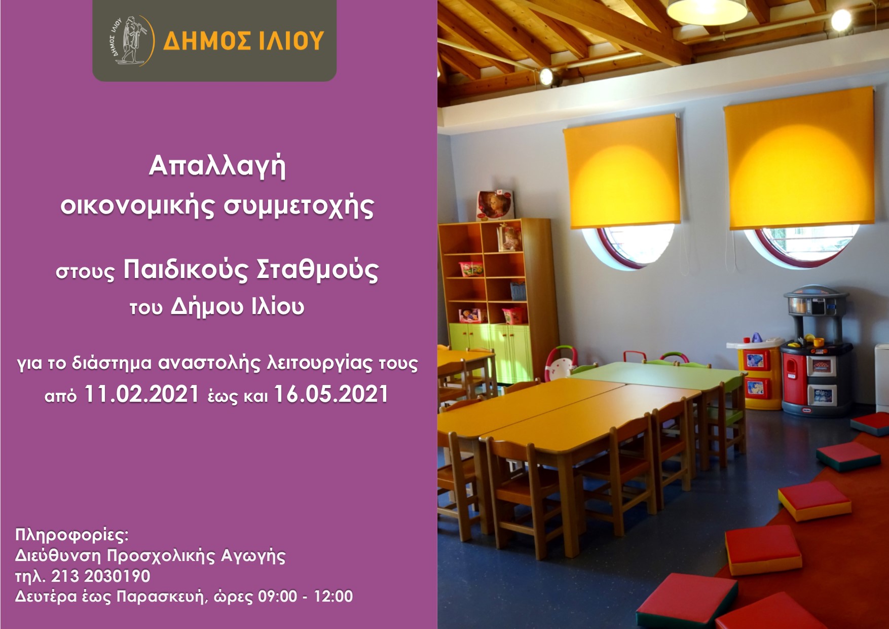 Ο Δήμος Ιλίου ενημερώνει ότι, απαλλάσσονται οι οικογένειες από την υποχρέωση καταβολής οικονομικής συμμετοχής στους Παιδικούς Σταθμούς για όσο χρονικό διάστημα βρίσκονταν σε αναστολή λειτουργίας κατ’ εφαρμογή των περιοριστικών μέτρων για την προστασία της δημόσιας υγείας, δηλαδή από 11.02.2021 έως και 16.05.2021.